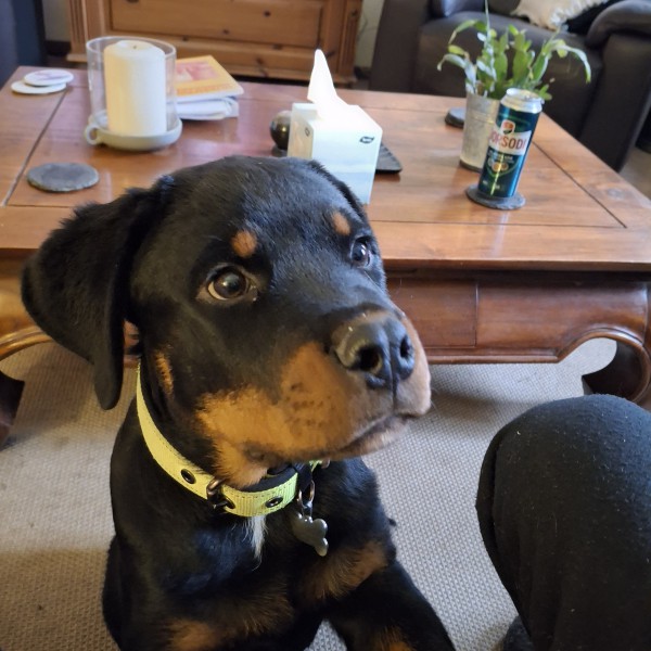 Vrolijke ondeugende rottweiler. Houd van werken